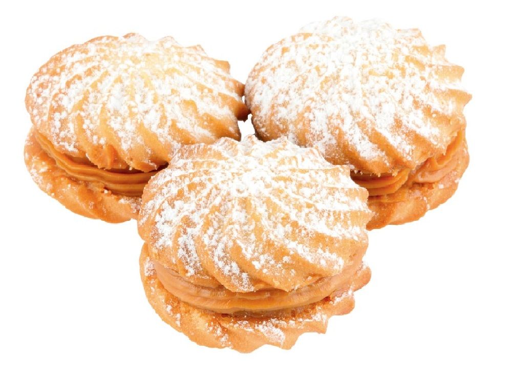 Песочное печенье в виде цветка, склеенное вареным сгущенным молоком,декорированное сахарной пудрой.Классическое исполнение!