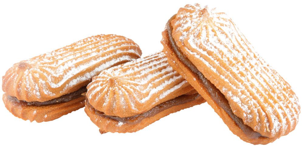 Легендарное песочное печенье удлиненной формы, склеенное фруктовым повидлом и сверху присыпанное сахарной пудрой.