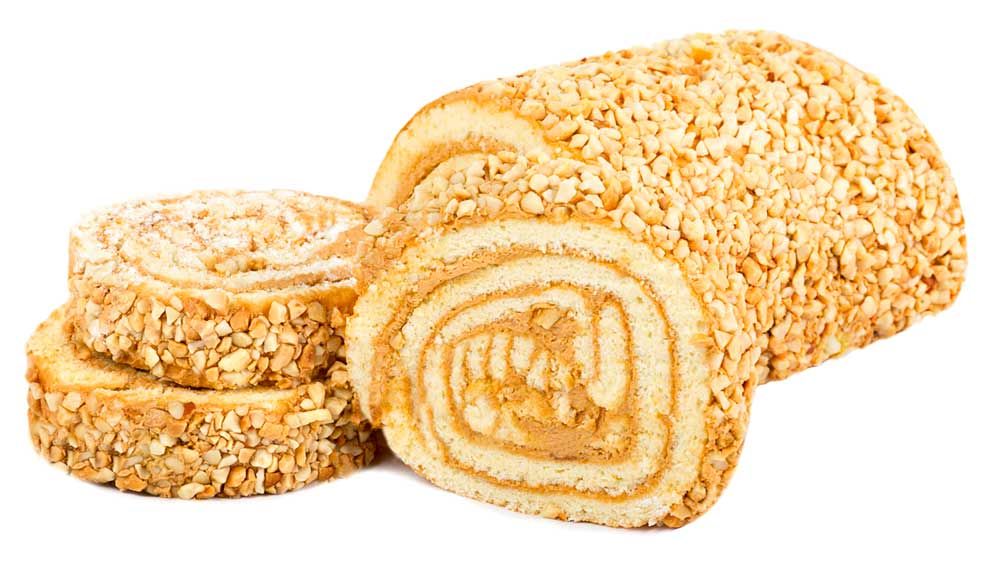 Нежный бисквитный рулет с начинкой из сливочного крема с добавлением вареного сгущенного молока, сверху декорированный дробленым арахисом.